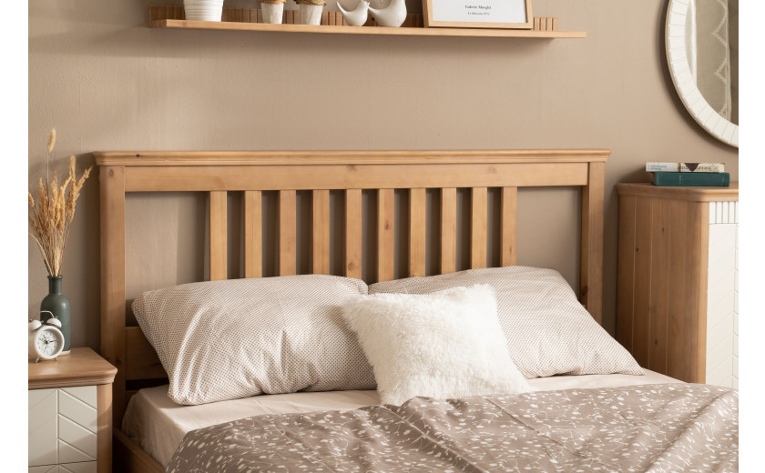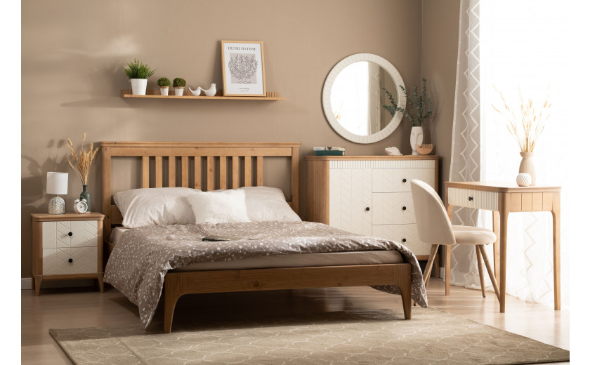 Кровать изготовлена из массива сосны. Цена указана в исполнении бесцветный лак. Стоимость изделия в другом цвете зависит от вида покрытия (бейц, эмаль). Коллекция мебели из сосны фабрики Timberica (Тимберика).